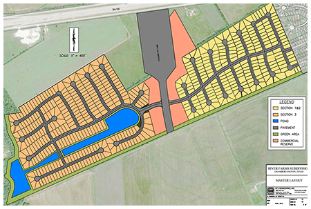 GC Engineering, Inc. provided professional planning and engineering services for the Master Drainage Plan (MDP) for the development of single family residential units for an approximately 214-acre tract known as River Farms. GCE staff developed the preliminary general land plan for the entire tract pursuant to the County requirements. The plan included single family residential lots, proposed storm water detention ponds, approximate Right-Of-Way of Future FM 1409, commercial reserves, and multi-family residential areas as appropriate. GCE staff also prepared a Master Drainage Plan and Drainage report for the entire project site in general accordance with county requirements.